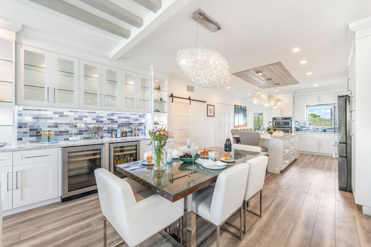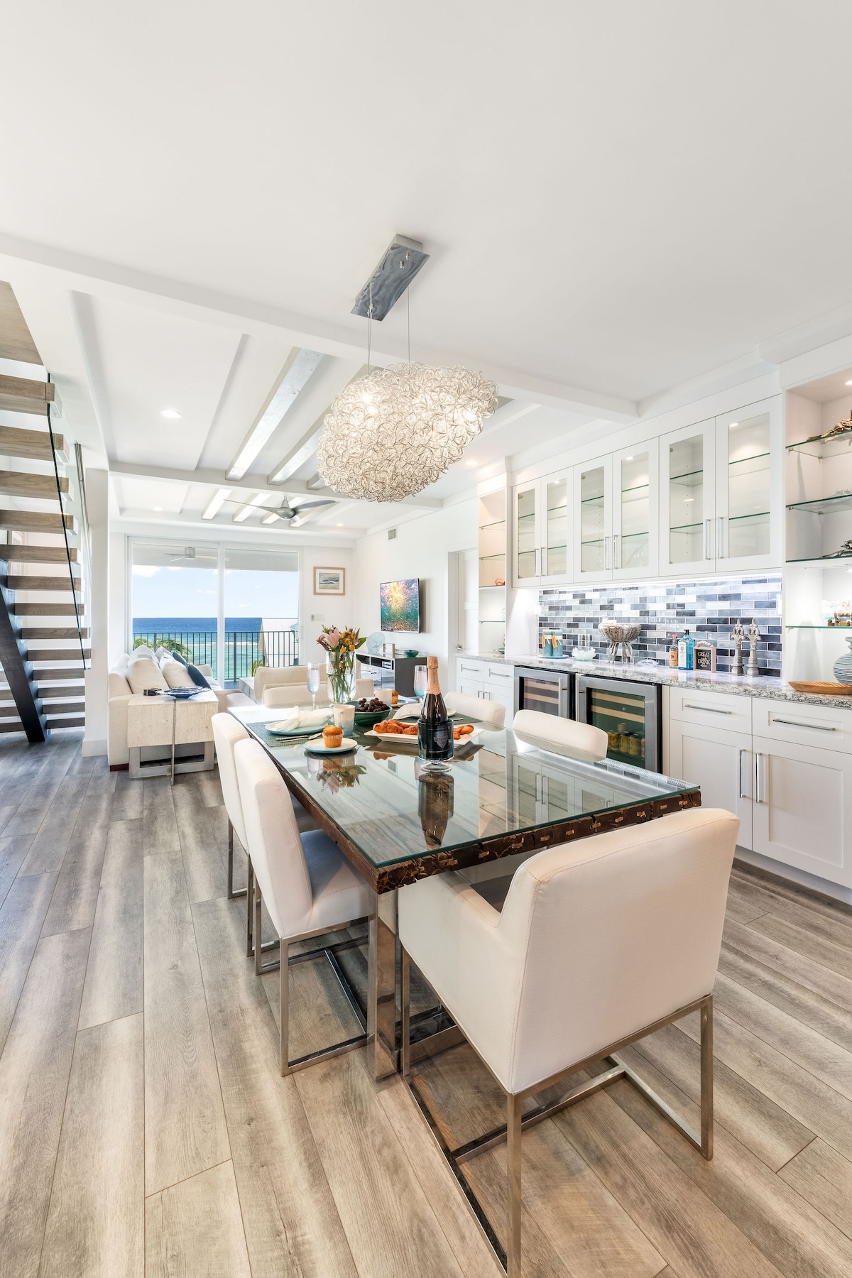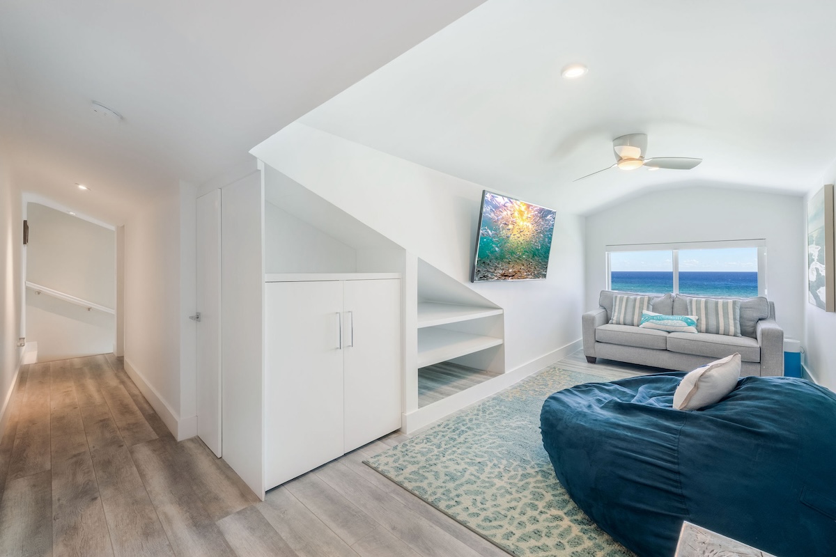 At the heart of the home, the kitchen is both functional and striking—anchored by a substantial full-slab island that invites gathering, conversation, and culinary creativity. A glass display entertainment bar, enhanced by ambient LED lighting and dual under-cabinet beverage centers, sets the stage for effortless entertaining. Expansive glass doors open seamlessly onto a 294-square-foot ocean-view lanai, where indoor and outdoor living blend beautifully. Here, mornings begin with coffee at sunrise, afternoons drift by with ocean breezes, and evenings are reserved for al fresco dining and sunset cocktails.