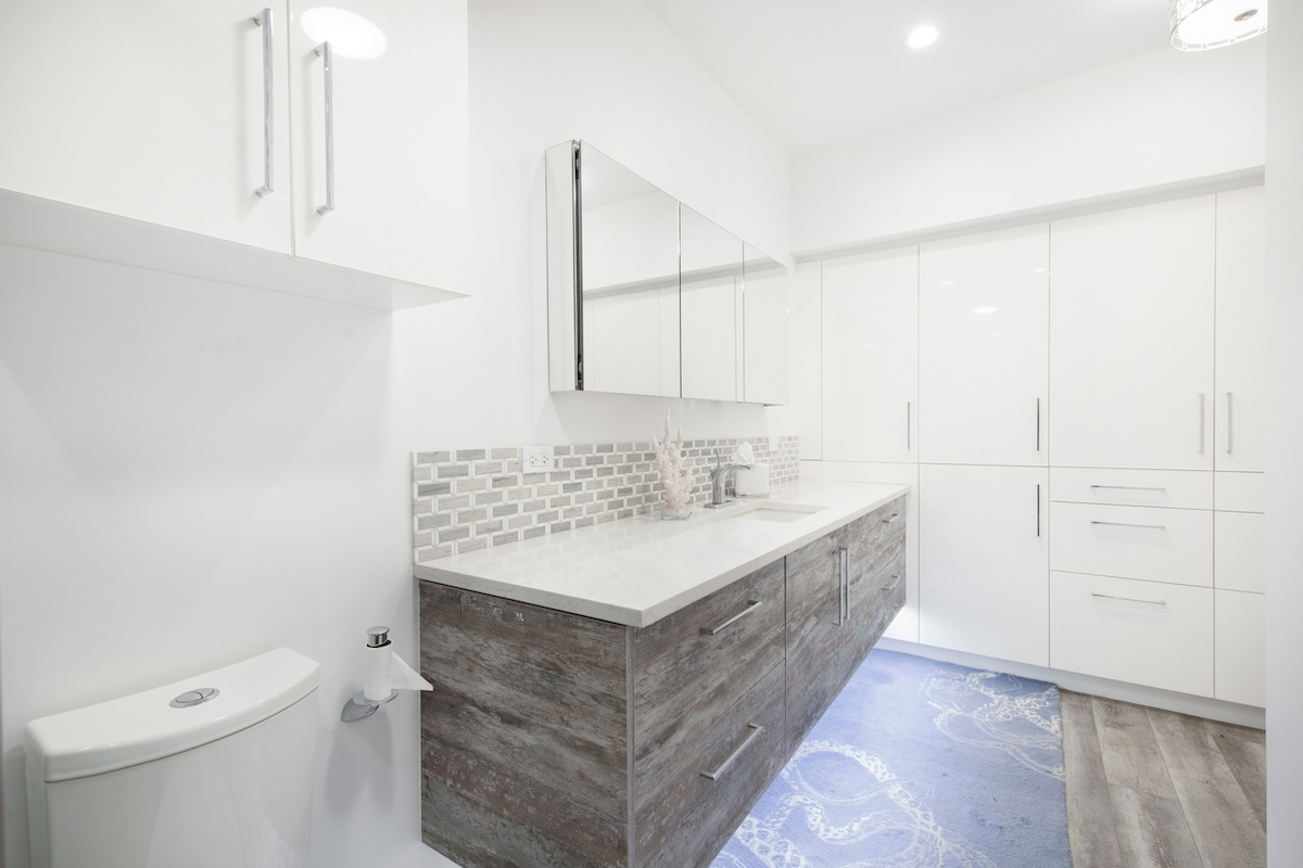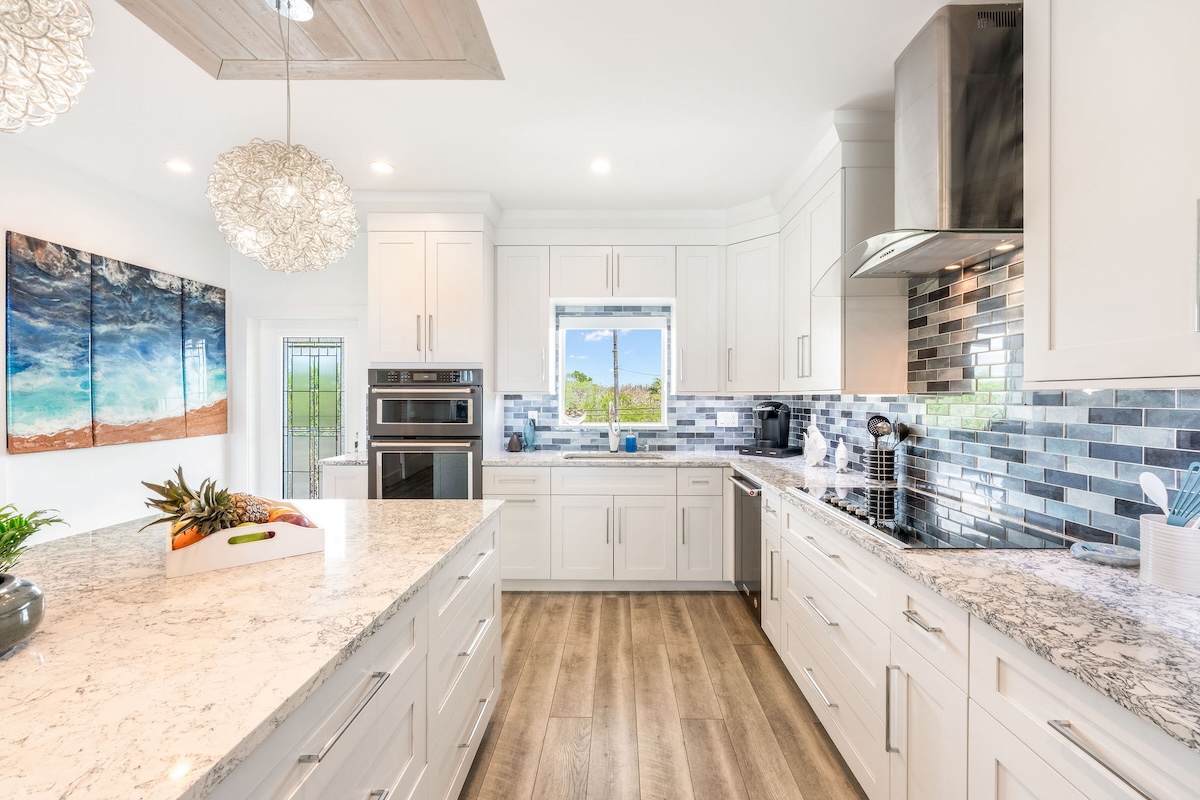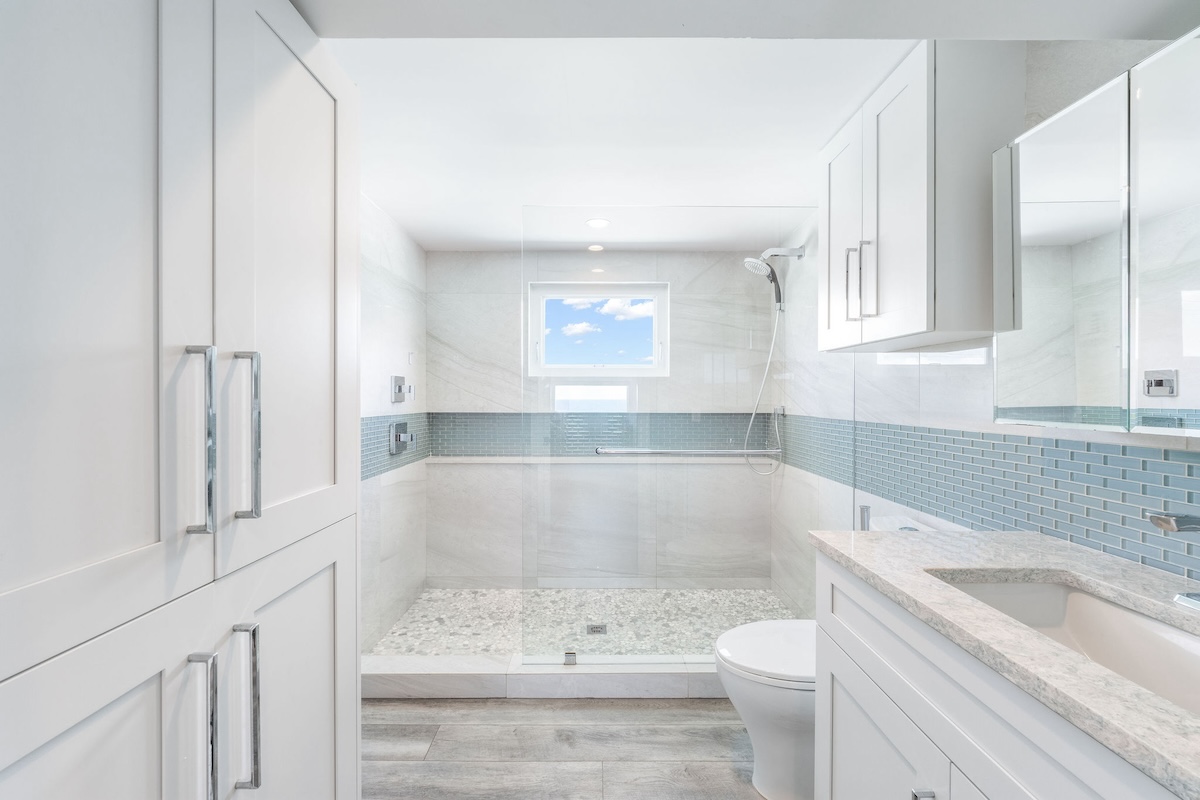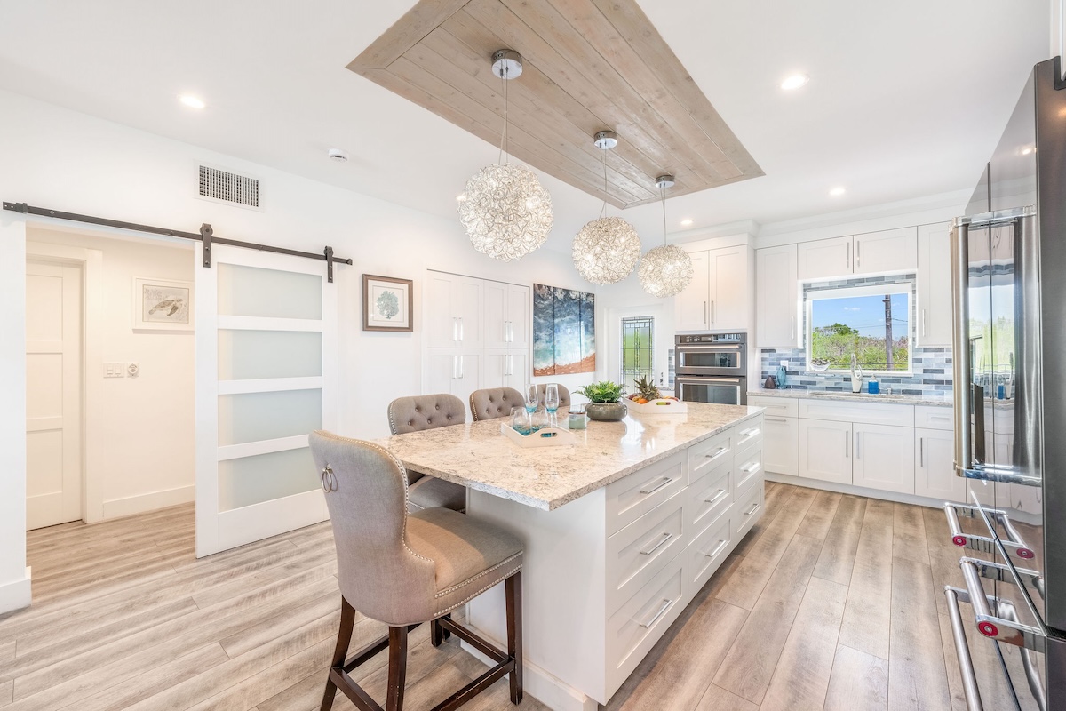 At the heart of the home, the kitchen is both functional and striking—anchored by a substantial full-slab island that invites gathering, conversation, and culinary creativity. A glass display entertainment bar, enhanced by ambient LED lighting and dual under-cabinet beverage centers, sets the stage for effortless entertaining. Expansive glass doors open seamlessly onto a 294-square-foot ocean-view lanai, where indoor and outdoor living blend beautifully. Here, mornings begin with coffee at sunrise, afternoons drift by with ocean breezes, and evenings are reserved for al fresco dining and sunset cocktails.
